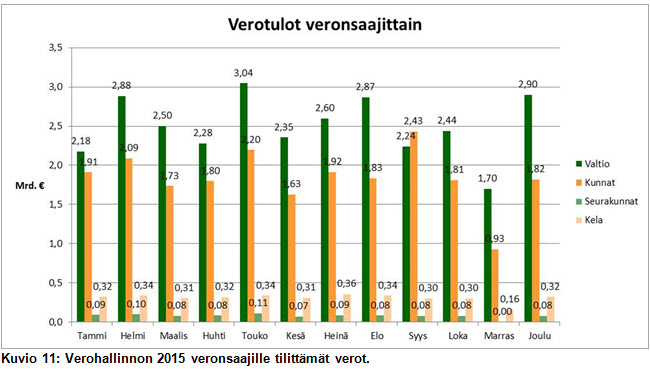 Verohallinto tilitti vuonna 2016 veronsaajille yhteensä 56,6 miljardia. Summa poikkeaa 2016 nettokertymistä, koska muille veronsaajille kuin valtiolle tilitetään kerran kuukaudessa ja kertymisjakso alkaa jo edellisen kuukauden 18. päivä (tässä tapauksessa 18.12.2015) ja päättyy tilityskuukauden 17. päivä (tässä tapauksessa 17.12.2016).