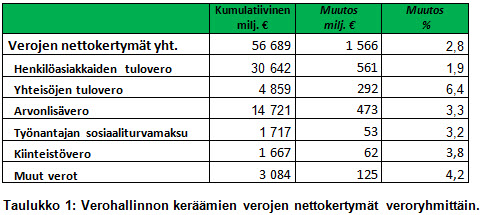 Verohallinnon vuonna 2016 keräämät verojen nettokertymät olivat yhteensä 56,7 miljardia euroa. Kasvua vuoteen 2015 verrattuna tuli lähes 1,6 miljardia (+2,8 %). Verohallinnon verokertymissä ei näy Tullin ja Trafin keräämät verot.