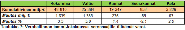 Verohallinto tilitti tammi-lokakuussa veronsaajille yhteensä 48 810 miljoonaa, josta valtion osuus oli 52 %, kuntien 40 %, seurakuntien 2 % ja Kansaneläkelaitoksen 7 %. Tilityssumma poikkeaa tammi-lokakuun nettokertymistä, koska muille veronsaajille kuin valtiolle tilitetään kerran kuukaudessa ja kertymisjakso alkaa jo edellisen kuukauden 18. päivä ja päättyy tilityskuukauden 17. päivä.