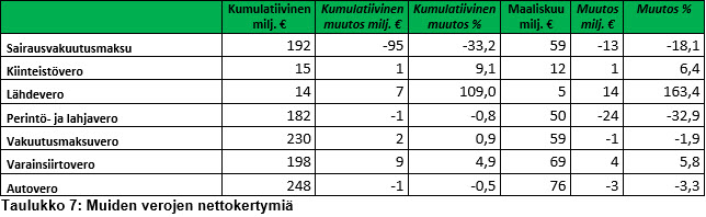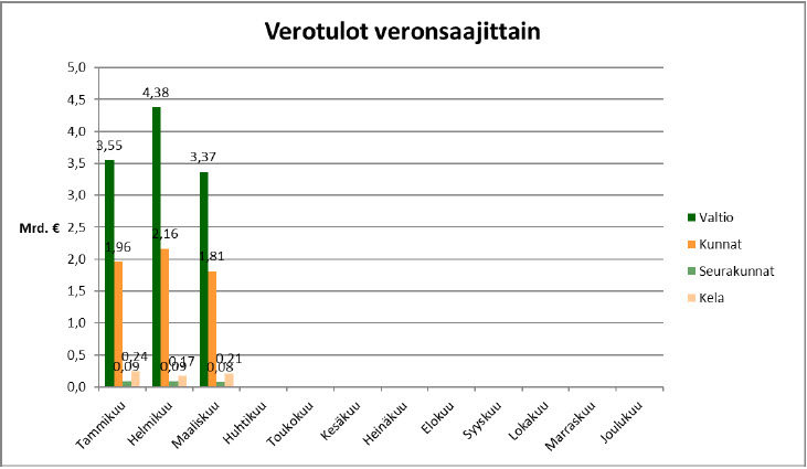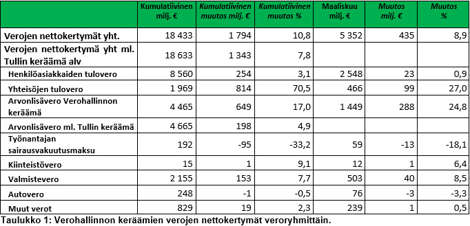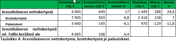 Vuoden 2018 alusta Verohallintoon siirtyi Tullin keräämä maahantuonnin arvonlisävero. Kun Tullin viime vuonna ja tammi-helmikuussa (noin 200 miljoonaa) keräämät arvonlisäverot huomioidaan, on verojen nettokertymä kasvanut tammi-maaliskuussa 7,8 prosenttia (1 343 miljoonaa).