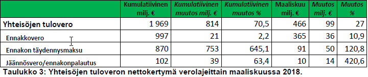 Verohallinto keräsi tammi-maaliskuussa 2018 veroja yhteensä 18 433 miljoonaa euroa. Alkuvuonna erityisen paljon on kasvanut yhteisöverokertymä, jonka kasvua selittää verotusmenettelymuutos, joka kasvatti erityisesti tammikuussa maksettuja veroja.