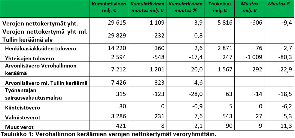 Arvonlisäverokertymille suuret kuukausi- ja satunnaisvaihtelut ovat varsin tavallisia, joten vuoden kumulatiivinen muutosprosentti tarjoaa totuudenmukaisemman kuvan arvonlisäveron suunnasta kuin yksittäisten kuukausien luvut.