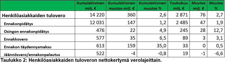 Henkilöasiakkaiden tuloveroa kertyi tammi-toukokuussa yhteensä 14 220 miljoonaa, joka oli 360 miljoonaa (+2,6 %) enemmän kuin vuotta aiemmin.Ennakonpidätyksiä tästä oli 12 031 miljoonaa ja niiden määrä kasvoi edellisestä vuodesta 147 miljoonaa (+1,2 %) (kts. Henkilöasiakkaiden ennakonpidätysten nettokertymä toimialoittain). Taulukossa 2 on tuloveron verolajien nettokertymät tammi-toukokuulta 2018.