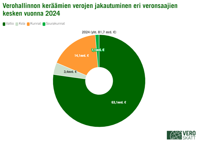 Vuonna 2024 Verohallinnon keräämistä veroista 77,2 prosenttia tilitettiin valtiolle ja 17,3 prosenttia kunnille. Muita veronsaajia ovat lisäksi seurakunnat 1,3 prosentin ja Kela 4,2 prosentin osuuksilla.