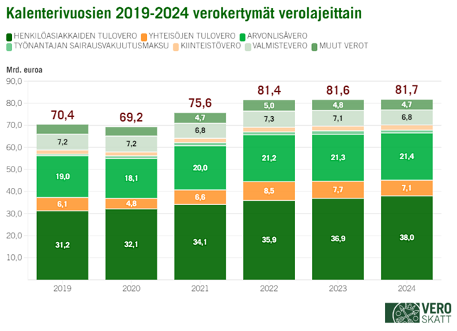 Verohallinnon vuonna 2024 keräämien verojen nettokertymät olivat yhteensä 81,7 miljardia euroa, joka oli niukasti 0,1 miljardia euroa (+0,1 %) enemmän kuin vuonna 2023. Kasvu oli yhtä niukkaa myös vuotta aiemmin, sillä vuodesta 2022 vuoteen 2023 Verohallinnon nettokertymät kasvoivat niin ikään vain 0,1 miljardia euroa (+0,1 %). Myös kehityssuunnat suurissa verolajeissa noudattelivat vuonna 2024 hyvin samankaltaista uraa kuin vuonna 2023. Vuonna 2024 henkilöasiakkaiden tuloverokertymä nousi 1,1 miljardia (+3,0 %) ja vuonna 2023 1,0 miljardia (+2,7 %). Vuonna 2024 arvonlisäverokertymä kasvoi 0,1 miljardia (+0,7 %) ja vuonna 2023 0,1 miljardia (+0,4 %). Yhteisöverokertymä laski vuonna 2024 0,6 miljardia (-7,9 %) ja vuonna 2023 hieman enemmän 0,8 miljardia (-9,4 %). Yhteisöveron kohdalla on kuitenkin hyvä muistaa, että kalenterivuosikohtaisissa verokertymissä on paljon veronmaksun ajoittumiseen liittyviä sekä muita satunnaismuuttujia, joten vertailukelpoisuuden saamiseksi yhteisöveroa kannattaa tarkastella aina verovuosikohtaisesti.