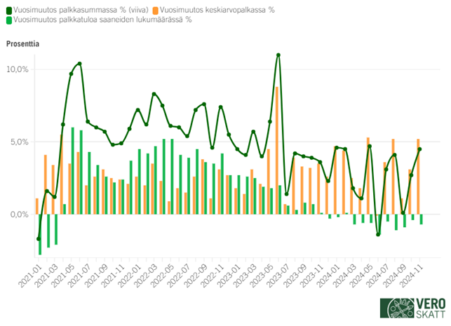 Vuoden 2024 lopussa tuoreimmat palkkasumma- ja muut ennakonpidätysten alaisten ansiotulojen ilmoitustiedot olivat marraskuun 2024 verokaudelta. Tammi-marraskuun 2024 ennakonpidätyksen alaiset ansiotulot olivat alustavien tietojen mukaan noin +3,6 prosenttia vuotta aiempaa suuremmat koostuen palkkasumman +2,6 prosentin noususta, eläkkeiden +6,3 prosentin noususta, työttömyysetuuksien +5,0 prosentin noususta sekä muiden veronalaisten sosiaalietuuksien reilun +4 prosentin noususta. Palkkasumman kasvu hidastui vuodesta 2023, jolloin palkkasumma kasvoi +4,7 prosenttia.