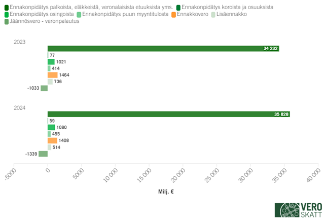 Muista verolajeista vuonna 2024 merkittävimmät kertymämuutokset tapahtuivat rajoitetusti verovelvollisten lähdeverossa sekä yleisesti verovelvollisten korkotulojen lähdeverossa.