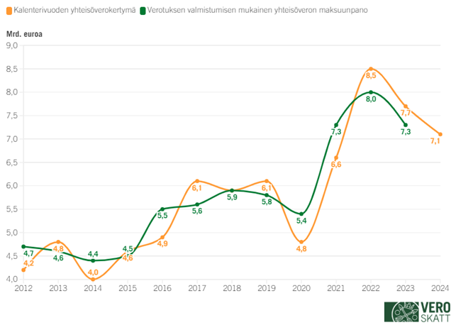 Yhteisöjen tuloveroa kertyi vuonna 2024 yhteensä 7 133 miljoonaa, joka oli 608 miljoonaa (-7,9 %) vähemmän kuin vuonna 2023.
