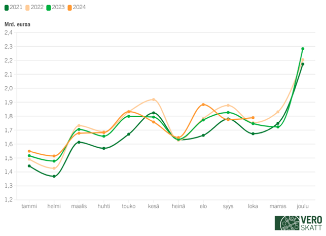 Arvonlisävero ilmoitetaan ja maksetaan verokautta seuraavan toisen kuukauden 12. päivä mennessä, joten vuoden 2024 arvonlisäverokertymä on pääosin 2023 marraskuun - 2024 lokakuun verokausilta syntynyttä veroa. Ko. verokausilla 11/2023 - 10/2024 ilmoitetun arvonlisäveron määrä oli samaisen noin +0,7 prosenttia suurempi kuin vuotta aiemmilla verokausilla 11/2022 - 10/2023. Arvonlisäveron yleistä verokantaa korotettiin syyskuun 2024 verokaudesta alkaen, joten verokantamuutos ehti vaikuttaa kalenterivuoden 2024 alv-kertymään eräpäivärytmityksen mukaisesti kahden kuukauden ajan (marras- ja joulukuussa). Juuri ennen verokantamuutoksen voimaan astumista eli elokuun 2024 verokauden kohdalla (kts. kuva 7) näkyy tavallista suurempi piikki, mikä kertonee kuluttajien ostoskäyttäytymisestä alemman verokannan loppumetreillä. Vastaavasti syys- ja lokakuun 2024 verokausien yhteenlaskettu alv-nettomäärä on korkeammasta verokannasta huolimatta kutakuinkin yhtä suuri kuin vuotta aiempi nettomäärä, eli verokantamuutos sai todennäköisesti osan kuluttajista aikaistamaan ostoskäyttäytymistään verokantamuutosta edeltäneeseen aikaan.