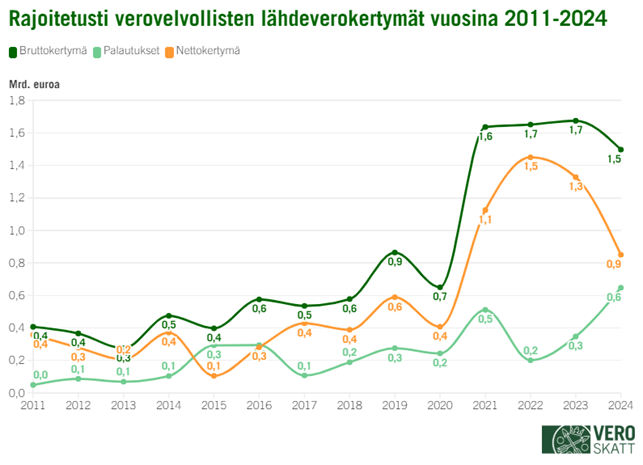 Rajoitetusti verovelvollisten lähdeveron nettokertymä oli vuonna 2024 yhteensä 850 miljoonaa, joka oli 478 miljoonaa (-36,0 %) vähemmän kuin vuonna 2023. Lähdeverosta suurin osa koostuu osinkojen lähdeverosta. Lähdeveron bruttokertymä oli vuonna 2024 1 498 miljoonaa, joka oli 177 miljoonaa (-10,6 %) vähemmän kuin vuotta aiemmin. Vastaavasti lähdeveron palautusten määrä oli 648 miljoonaa, joka oli 301 miljoonaa (+86,6 %) enemmän kuin vuotta aiemmin. Palautuksista noin 160 miljoonaa oli kuluvaa verovuotta eli verovuotta 2024 koskevia ilmoitusoikaisuja (ns. quick refundit) ja noin 490 miljoonaa varsinaisia lähdeveron palautushakemusten kautta haettuja vanhempia vuosia koskevia palautuksia.