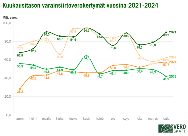 Kuva 9: Varainsiirtoveron kuukausikertymät 2021–2024. Luvut milj. €.