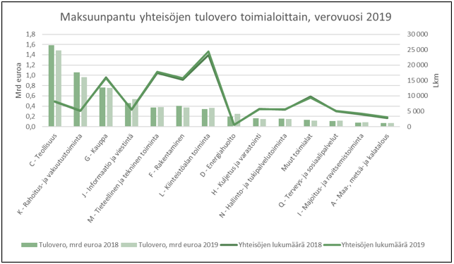 Toimialoittain tarkasteltuna eniten yhteisöveron maksajia oli kiinteistöalan ja tieteellisen ja teknisen toiminnan toimialoilla sekä rakentamisen ja kaupan aloilla (yhteensä 58,3 % yhteisöveron maksajista). Eniten yhteisöveroa maksuunpantiin puolestaan teollisuuden toimialalla (25,6 % yhteisöveron kokonaismäärästä), rahoitus- ja vakuutustoiminnassa (16,6 %) ja kaupan alalla (13 %). Näillä kaikilla kolmella toimialalla yhteisöveron määrä laski edellisvuodesta. Teollisuuden toimialalla yhteisöveroa maksuunpantiin erityisesti metalliteollisuudessa (TOL 24-30), missä yhteisöveron kokonaismäärä oli 0,5 miljardia euroa (-7,7 % vuoteen 2018 verrattuna).