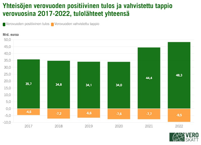 Kuva 1: Yhteisöjen verovuoden positiivinen tulos ja vahvistettu tappio verovuosina 2017–2022