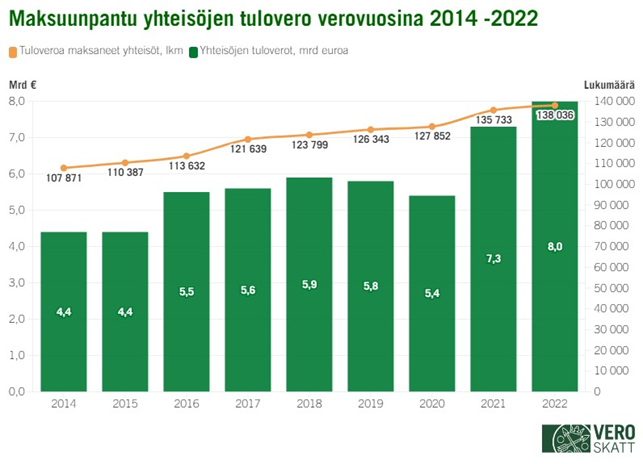 Yhteisöasiakkaille määrättiin verovuodelta 2022 tuloveroa yhteensä 8,01 miljardia euroa, mikä on noin 0,73 miljardia euroa (+10,1 %) enemmän kuin vuonna 2021. Tuloveroa maksuunpantiin noin 138 000 yhteisölle, mikä on vajaa 2 300 yhteisöä (+1,7 %) enemmän kuin vuotta aiemmin. Yhteisöveroa määrättiin maksettavaksi 42,2 prosentille yhteisöistä. Yhteisöveron kasvu keskittyi verovuonna 2022 etenkin teollisuuden ja energiahuollon toimialoille, usealla muulla toimialalla yhteisöveron määrän kasvu jäi pieneksi tai laski vuoteen 2021 verrattuna.