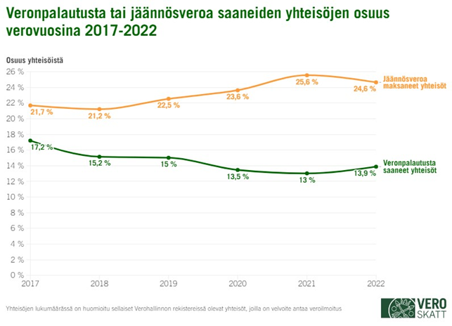 Vuonna 2022 veronpalautusta saaneiden yhteisöjen osuus aktiivisista yhteisöistä oli 13,9 prosenttia. Jäännösveroa maksaneiden yhteisöjen osuus oli puolestaan 24,6 prosenttia. Yhteisö ei saa veronpalautusta tai jäännösveroa esimerkiksi silloin, jos sillä ei ole ollut toimintaa verovuonna tai jos yhteisön verovuodelta maksamat ennakkoverot ovat vastanneet verovuodelta maksuunpantujen verojen määrää. Veronpalautusta tai jäännösveroa ei palauteta tai määrätä myöskään silloin, jos sen määrä jää alle kymmenen euron.