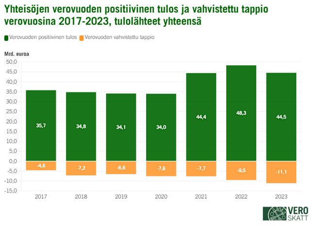 Vuosi 2023 oli yrityksille vuotta 2022 haasteellisempi muun muassa kohonneen inflaatio- ja korkotason seurauksena. Tämä näkyy myös yritysten verovuoden 2023 tuloksissa ja yrityksille maksuunpannun yhteisöveron määrässä. Yhteisöistä 54,9 prosenttia (184 500 kappaletta) teki positiivisen tuloksen vähintään yhdestä tulolähteestä verovuonna 2023. Lukumäärä kasvoi edellisvuodesta 1,7 prosentilla. Yhteisöjen verovuoden 2023 positiivinen tulos ennen tappioiden vähentämistä oli yhteensä 44,5 miljardia euroa, missä laskua edellisvuoteen verrattuna oli noin 3,8 miljardia euroa (-7,9 %). Keskimääräinen verovuoden positiivinen tulos vuonna 2023 oli noin 241 000 euroa (mediaani 12 165 euroa), kun se verovuonna 2022 oli noin 266 000 euroa (mediaani 13 272 euroa). Yrityksen verovuoden positiivinen tulos saadaan, kun yrityksen veronalaisista tuotoista vähennetään vähennyskelpoiset kulut. Luvut verovuoden positiivisesta tuloksesta kuten myös muut artikkelissa esitetyt luvut ovat nimellisiä eli niissä ei ole huomioitu inflaation vaikutuksia.