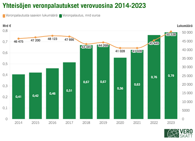 Veronpalautusta verovuodelta 2023 sai yhteensä noin 50 538 yhteisöä (+11,2 %). Verotuksen valmistumisen mukainen veronpalautusten määrä oli noin 787,1 miljoonaa euroa (+3,5 %). Tästä noin 550 miljoonaa euroa muodostui yli 50 000 euron suuruisista veronpalautuksista. Keskimääräinen palautus oli suuruudeltaan 15 575 euroa ja palautusten mediaani 2 176 euroa.