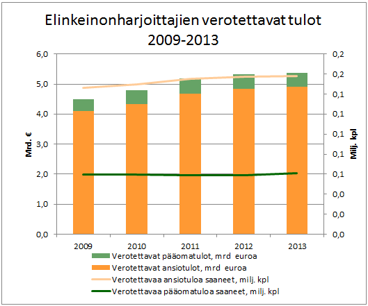Elinkeinonharjoittajien verotettavat tulot verovuodelta 2013 olivat 5,4 miljardia euroa (+ 2,5 %). Tuloista 4,9 miljardia (+0,9 %) oli ansiotuloja ja 0,5 miljardia (- 0,7 %) pääomatuloja. Verotettavaa ansiotuloa sai 157 793 elinkeinonharjoittajaa (+ 0,2 %) ja verotettavaa pääomatuloa sai 60 918 elinkeinonharjoittajaa (+ 3,4 %).