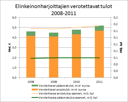 Elinkeinonharjoittajien verotettavat tulot verovuodelta 2011 olivat 5,2 miljardia euroa (+ 8 %). Verotettavaa tuloa muodostui yhteensä 499 216 elinkeinonharjoittajalle (n. + 3,7 %). Tuloista 4,7 miljardia (+8,5 %) oli ansiotuloja ja 0,5 miljardia (+ 7,4 %) pääomatuloja. Ansiotuloja sai 155 531 elinkeinonharjoittajaa (+ 3,7 %) ja pääomatuloja 59 175 elinkeinonharjoittajaa (- 0,5 %).