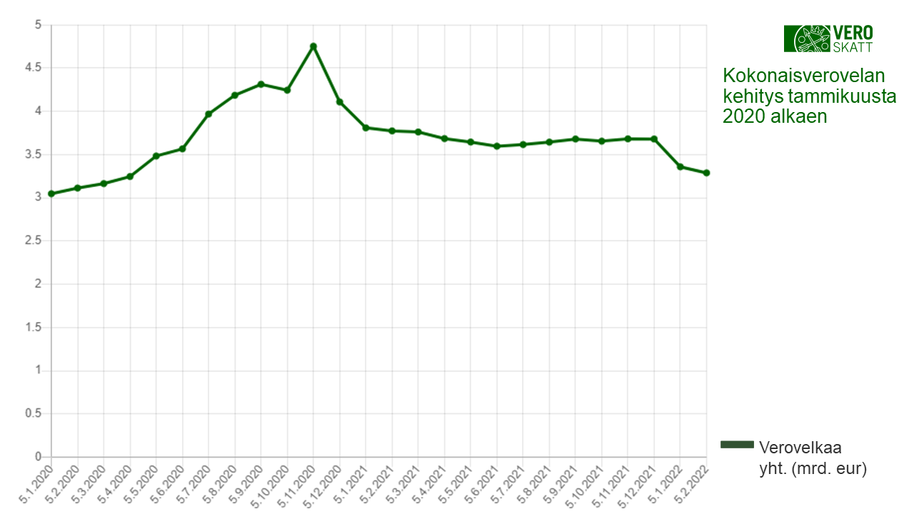 Juuri ennen pandemian alkamista, helmikuussa 2020 verovelkaa oli yhteensä 3,1 miljardia euroa. Korona-ajan korkein piikki verovelan määrässä oli marraskuussa 2020, jolloin veroja oli maksamatta yhteensä 4,8 miljardilla eurolla.