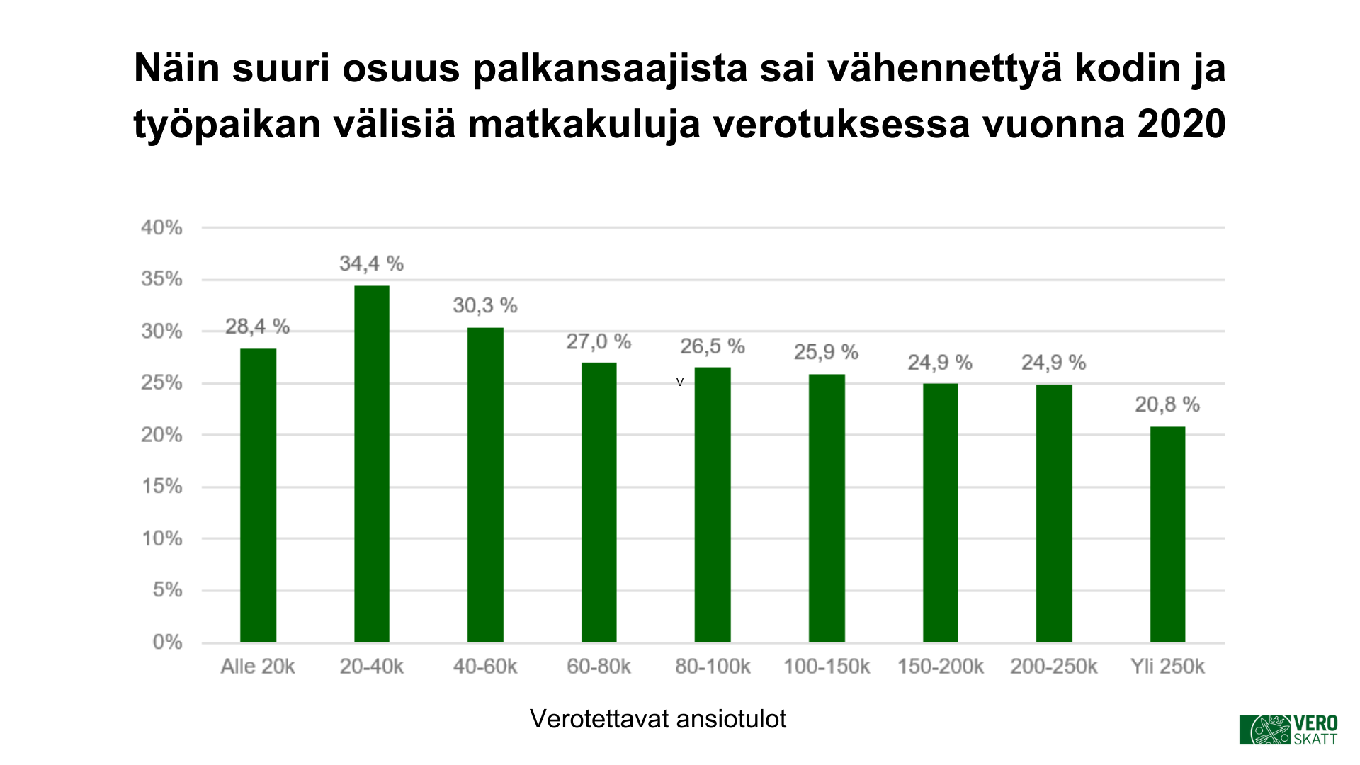 Verohallinnon tiedote, 18.2.2022Alle 40 000 euroa vuodessa ansaitsevat saivat Verohallinnolta eniten vähennyksiä kodin ja työpaikan välisistä matkakuluista vuonna 2020. Vähennyksen saajista 55 prosenttia oli miehiä. Eniten vähennyksiä saaneita oli toisen asteen ja alemman korkeakoulututkinnon suorittaneiden keskuudessa.
