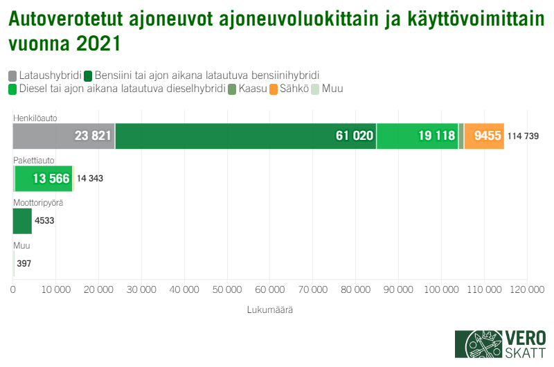 - Lataushybridit, yhteensä 19 000 autoa (osuus autoverotetuista uusista henkilöautoista 20 %).