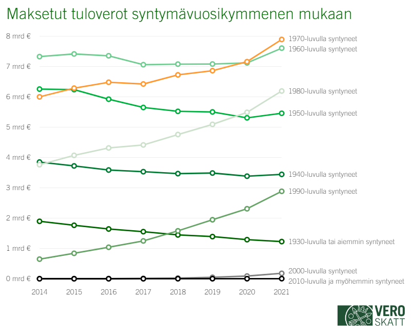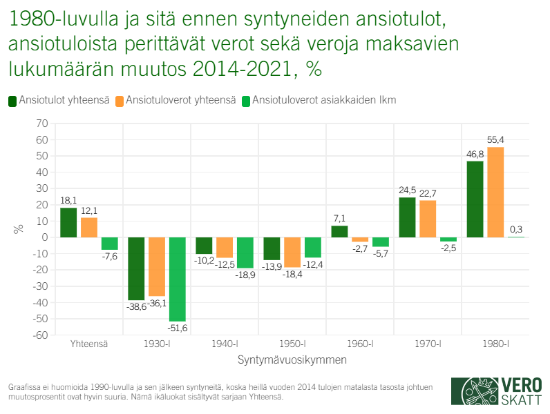 Eniten ansiotuloista maksettava verokertymä on laskenut 1930-luvulla tai sitä ennen syntyneillä (-36,1%). Verojen lasku on seurausta veroja maksavien henkilöiden lukumäärän puolittumisesta (-51,6%). Veroa maksavien henkilöiden lukumäärän puolittuminen johtuu toisaalta kuolleista mutta myös pienituloisille suunnatuista veronkevennyksistä. Vuonna 2014 30-luvulla tai sitä ennen syntyneistä 3,3 prosenttia ansiotuloja saavista ei maksanut ansiotuloistaan tuloveroja. Vuonna 2021 tällaisten asiakkaiden lukumäärä oli noussut 11,8 prosenttiin. Ennen kaikkea YLE-veroa maksavien osuus on laskenut vuosien 2014 ja 2021 välillä. Tässä ikäluokassa oli vuonna 2014 noin 80 tuhatta asiakasta, joiden ainoa vero oli pieni YLE-vero.