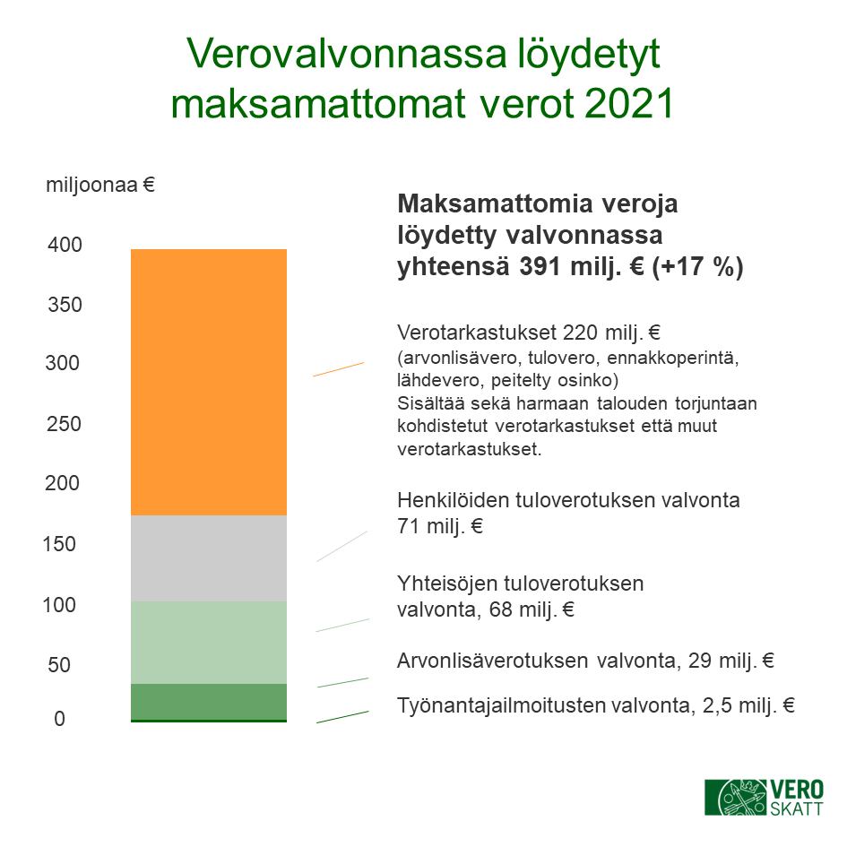 Verovalvonnassa löydetyt maksamattomat verot 2021. Maksamattomia veroja löydetty valvonnassa yhteensä 391 milj. € (+17 %). Verotarkastukset 220 milj. € (arvonlisävero, tulovero, ennakkoperintä, lähdevero, peitelty osinko), Sisältää sekä harmaan talouden torjuntaan kohdistetut tarkastukset että muut verotarkastukset.  Henkilöiden tuloverotuksen valvonta 71 milj. €. Yhteisöjen tuloverotuksen valvonta, 68 milj. €, Arvonlisäverotuksen valvonta 29 milj. €, Työnantajailmoitusten valvonta 2,5 milj. €