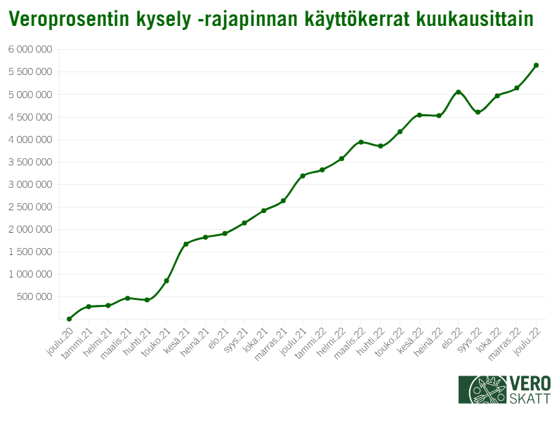 Verohallinnon rajapintoja on vuoden 2022 loppuun mennessä käytetty yli 122 miljoonaa kertaa. Suosituin on rajapinta, jonka avulla tieto työntekijän voimassa olevasta veroprosentista siirtyy suoraan Verohallinnon järjestelmästä työnantajalle. Tätä rajapintaa on käytetty yhteensä jo 71,6 miljoonaa kertaa.