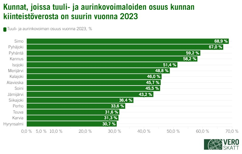 Verohallinnon tiedote, 13.11.2023Tuuli- ja aurinkovoimaloista maksettu kiinteistövero kasvoi koko maassa tänä vuonna yli 50 prosentilla. Tuuli- ja aurinkovoimaloista kertyvät kiinteistöveroeurot eivät kuitenkaan jakaudu tasaisesti: suurimpia hyötyjiä ovat erityisesti Pohjois-, Keski- ja Etelä-Pohjanmaan kunnat. Lapissa sijaitsevalla Simon kunnalla tuuli- ja aurinkovoimaloiden osuus kunnan kiinteistöverotuloista oli suurin: peräti liki 70 prosenttia kunnan kiinteistöverotuloista tulee tuuli- ja aurinkovoimaloista.