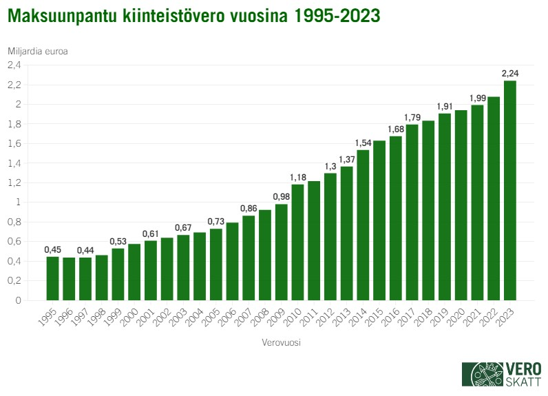 Kiinteistöveroja määrättiin maksettavaksi tänä vuonna kaikkiaan 2,2 miljardia euroa, mikä on noin 165 miljoonaa euroa (7,9 %) enemmän kuin viime vuonna. Syy tähän on rakennuskustannusindeksin reipas nousu.