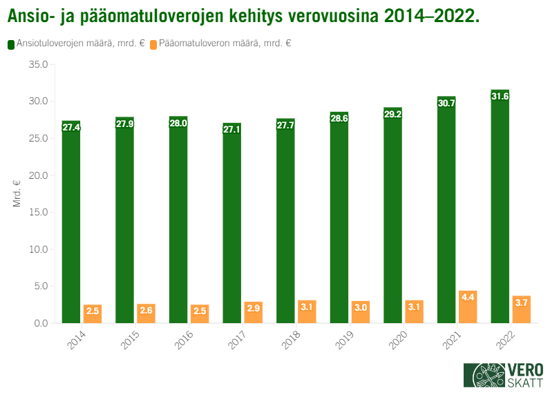 Ansiotuloverojen määrä kasvoi noin 920 miljoonalla yhteensä 31,6 miljardiin (+3,0 %). Vuoden 2022 ansiotuloverojen määrässä näkyy vakaa työllisyystilanne.