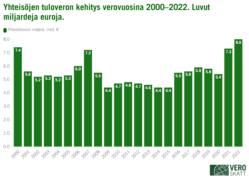 Yritykset ja muut yhteisöt maksoivat yhteisöveroa viime vuodelta kaikkiaan 8,0 miljardia euroa, mikä on peräti 10,1 prosenttia enemmän kuin vuotta aikaisemmin. Nimellisillä euromäärillä tarkasteluna se on kaikkien aikojen ennätys.