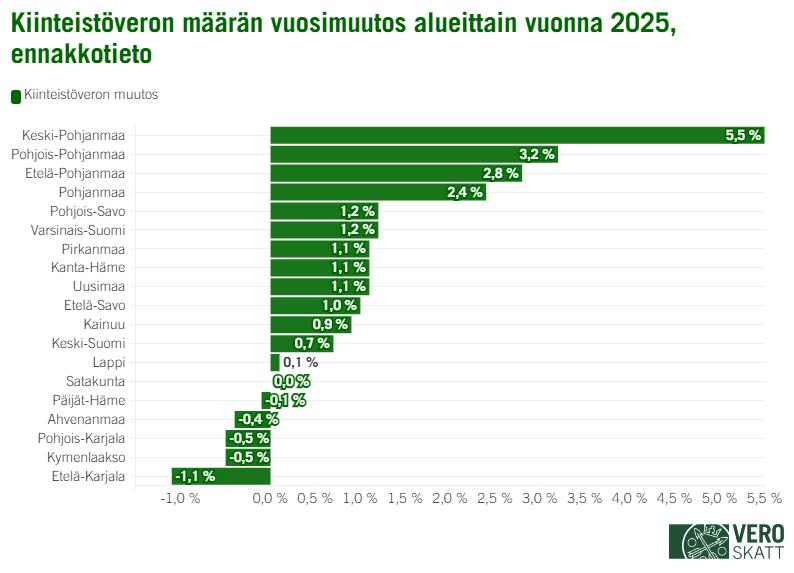 Vuodelle 2025 rakennusten yleistä kiinteistöveroprosenttia nostettiin 21 kunnassa ja laskettiin yhdessä kunnassa. Rakennusten yleinen kiinteistöveroprosentti on korkein Imatralla (1,90 %). Maapohjien yleistä kiinteistöveroprosenttia nostettiin 10 kunnassa ja laskettiin yhdessä kunnassa. Maapohjan kiinteistöveroprosentti on korkein Kaskisilla (2,00 %). Vakituisen asunnon kiinteistöveroprosenttia nostettiin 21 kunnassa ja laskettiin yhdessä kunnassa. Myös tämä prosentti on korkein Kaskisilla (1,00 %).