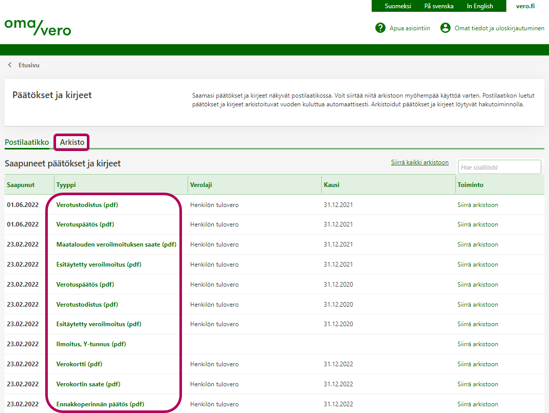 Listalla on kaikki päätökset ja kirjeet, jotka olet saanut 12 kuukauden aikana.