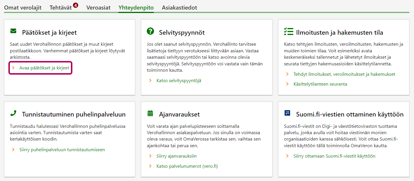 Verohallinnon lähettämän postin löydät OmaVerosta. Esimerkiksi verokortin, verotuspäätökset ja muut kirjeet voit avata sieltä pdf-tiedostoina. Kun olet saanut OmaVeroon uuden päätöksen tai kirjeen, se näkyy tehtävänä OmaVeron Tehtävät-välilehdellä.