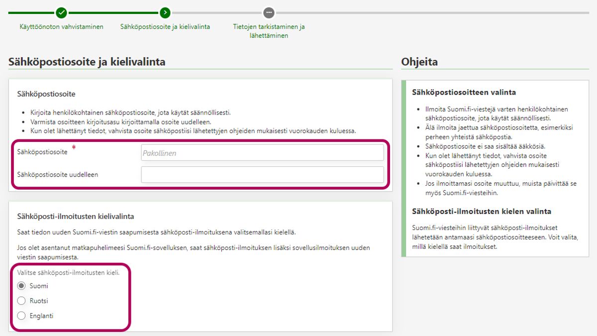 - Kun otat Suomi.fi-viestit käyttöön, sinun täytyy antaa sähköpostiosoitteesi ja vahvistaa se. Sen jälkeen siirryt OmaVeroon. Tieto viestien aktivoinnista näkyy OmaVerossa seuraavana päivänä.