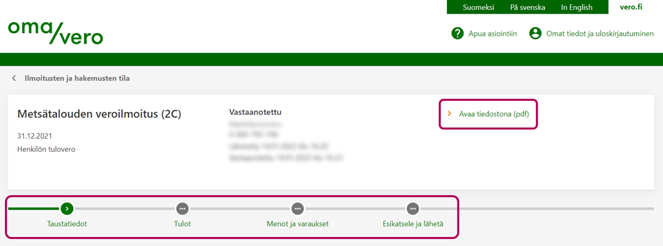 Voit käydä läpi esimerkiksi veroilmoituksen tiedot vaiheittain tai avata kaikki tiedot PDF-tiedostona linkistä Avaa tiedostona (pdf).