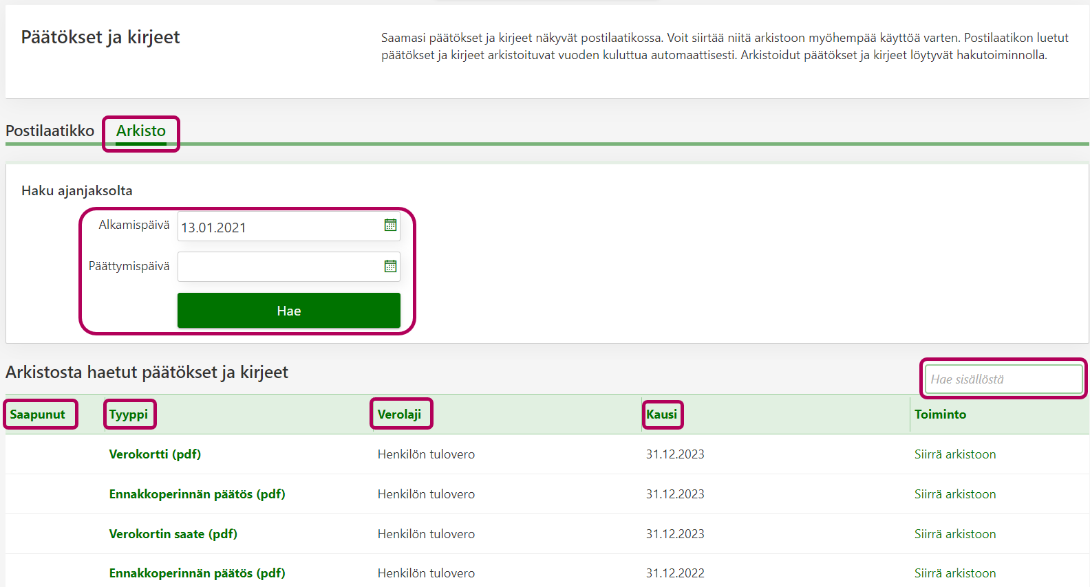 Lisäksi voit järjestellä sisältöä klikkailemalla sarakkeiden otsikoita, kuten sanoja Saapunut, Tyyppi tai Verolaji.