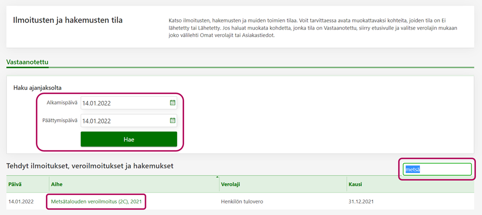 Kirjoita Hae sisällöstä -kenttään ilmoitusta tai hakemusta kuvaava asiasana tai osa siitä ja paina Enter. Esimerkiksi jos kirjoitat kenttään sanan "metsä", listassa näkyvät kaikki metsätalouden veroilmoitukset, jotka olet valitsemallasi ajanjaksolla lähettänyt.