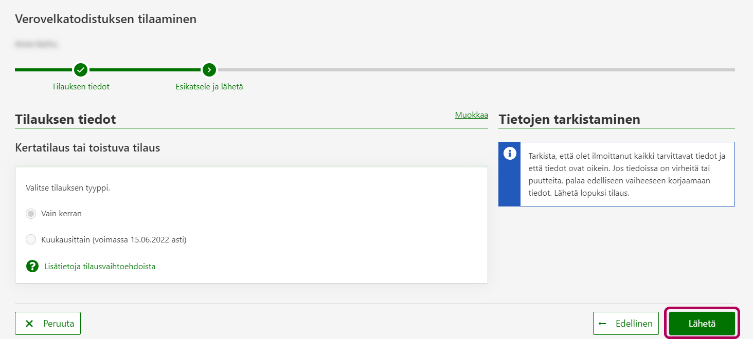 Vaihe Esikatsele ja lähetä: Tarkista, että tiedot ovat oikein. Valitse lopuksi painike Lähetä.