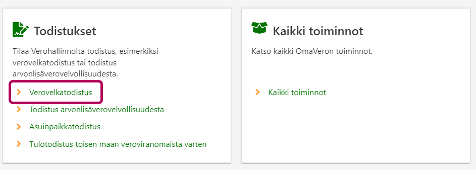 Valitse kohdasta Todistukset linkki Verovelkatodistus.