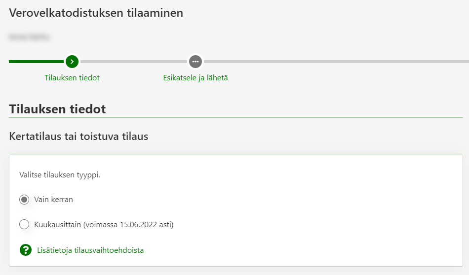 Vaihe Tilauksen tiedot: Valitse, haluatko tilata verovelkatodistuksen kerran vai joka kuukausi.