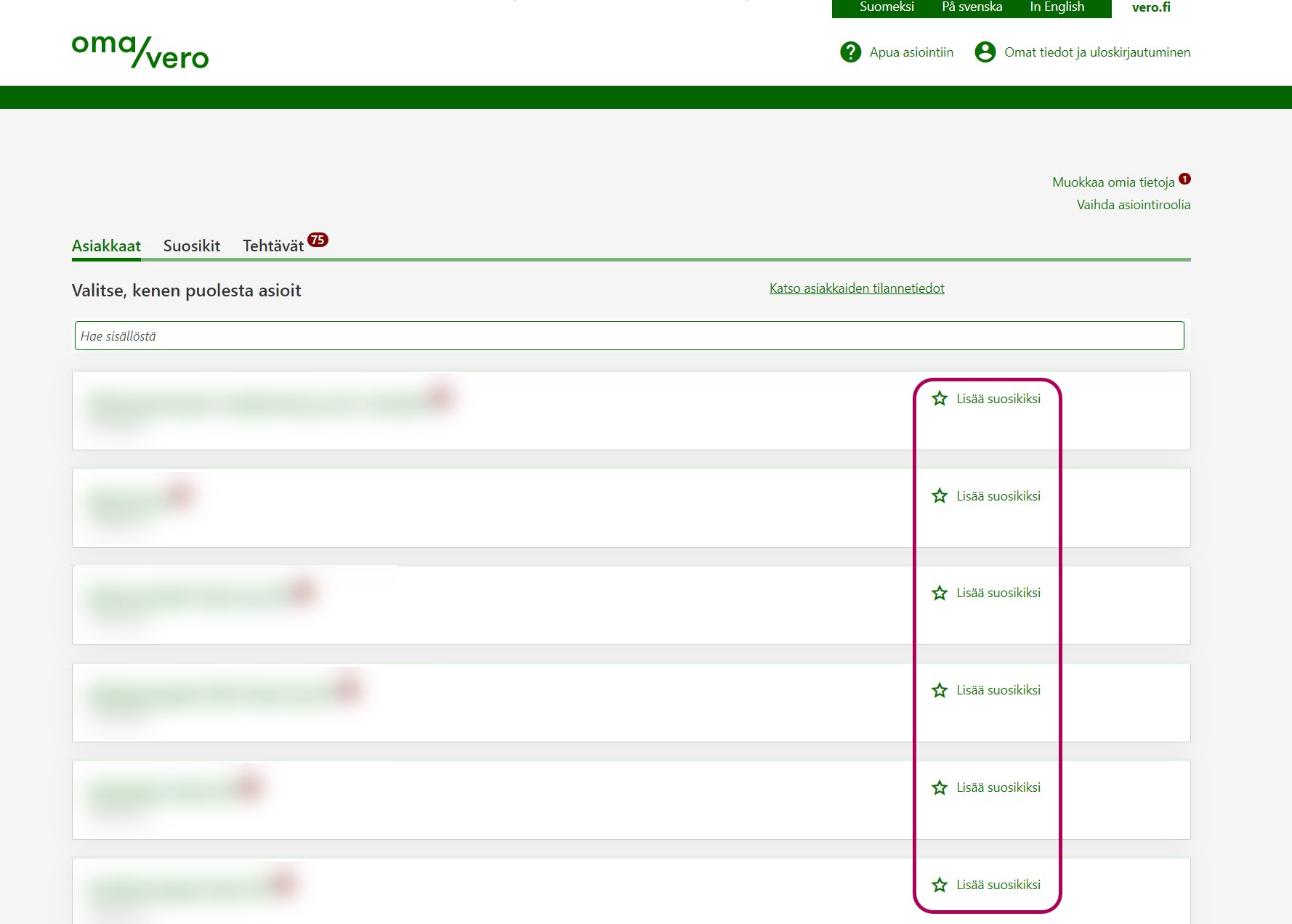 Näin valitset yrityksiä tai verolajeja omiin suosikkeihin OmaVerossa