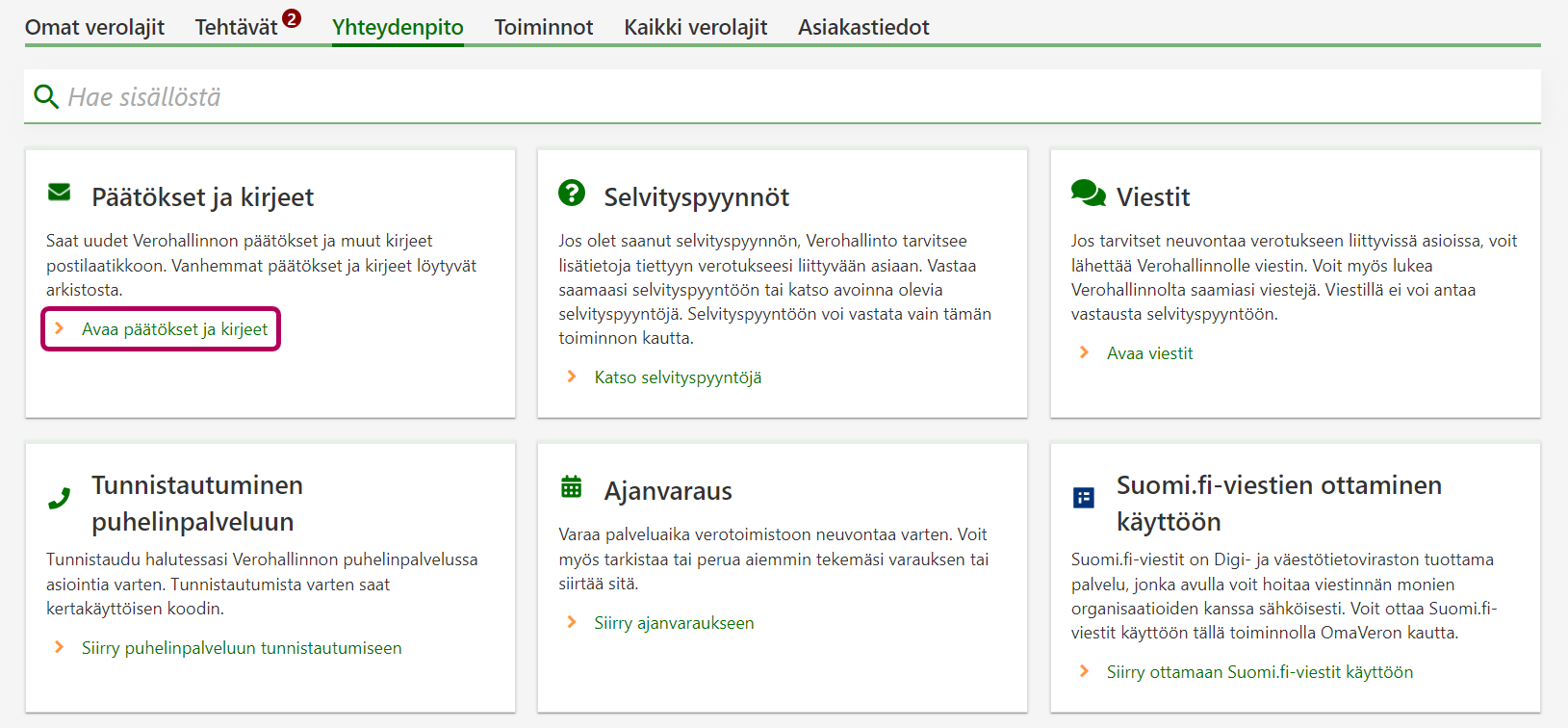 Kirjoita Hae sisällöstä -kenttään kirjeen tai päätöksen aihetta kuvaava asiasana tai osa siitä ja paina Enter. Esimerkiksi jos kirjoitat kenttään sanan "vero", listassa näkyvät kaikki kirjeet, joiden nimessä sana on. Jos sen sijaan kirjoitat sanan "verotus", hakutuloksia on vähemmän – esimerkiksi verotustodistus ja verotuspäätös.