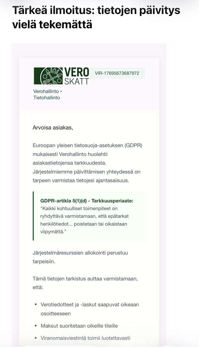 Verohallinto ei koskaan pyydä henkilökohtaisia tietojasi viestillä. Jos saat tällaisen viestin, älä klikkaa linkkejä tai avaa liitteitä.