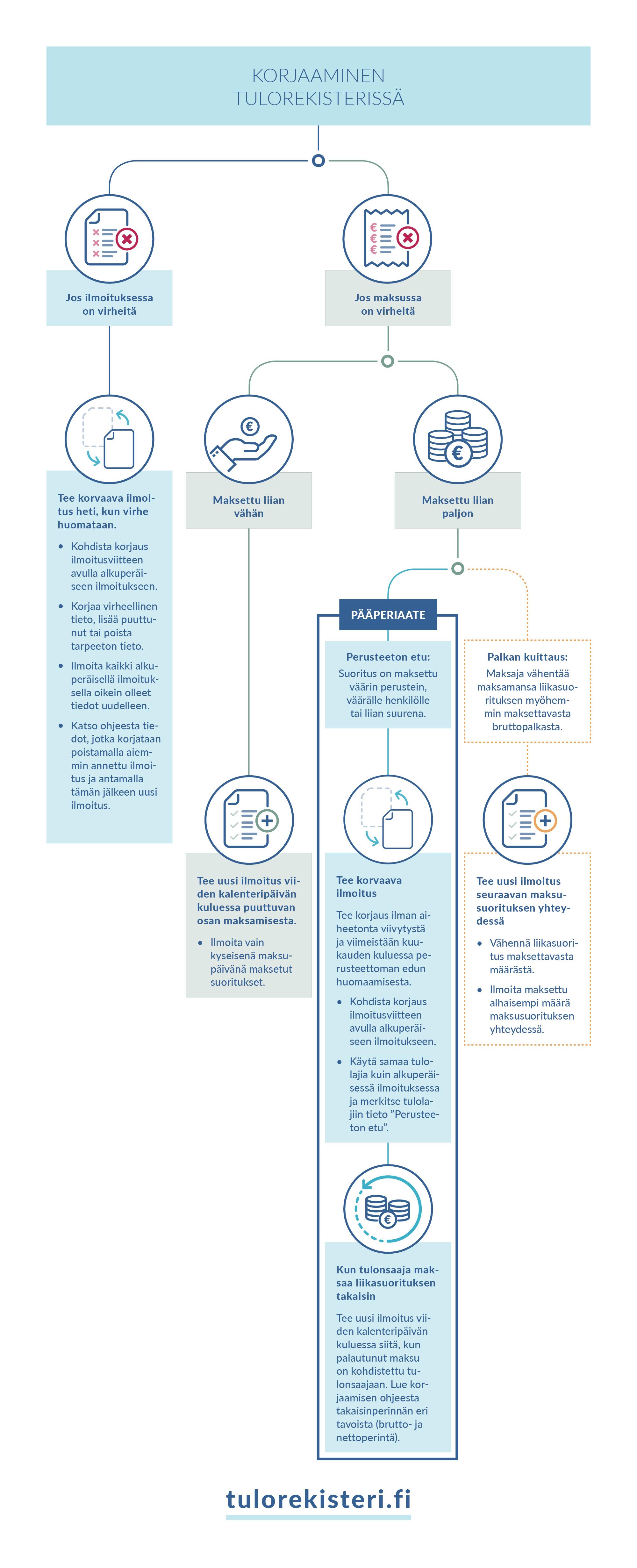 Työnantajan tai muun suorituksen maksajan on korjattava ilmoittamissaan palkkatiedoissa olevat virheet heti, kun virhe on huomattu. Tulorekisteriin ilmoitetuista tiedoista ja niiden korjaamisesta vastaa suorituksen maksaja. Tulorekisteriyksikön virkailija tai tulonsaaja ei voi korjata tietoja tulorekisteriin.