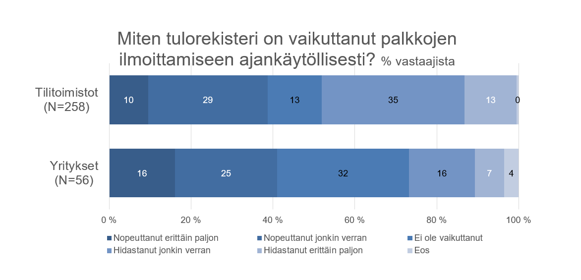 Tilitoimistoista 39 % kertoi tulorekisterin nopeuttaneen ilmoittamista. Tilitoimistoissa koetaan tulorekisterin hidastaneen palkkojen ilmoittamista kuitenkin useammin kuin muissa yrityksissä.