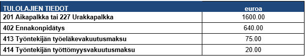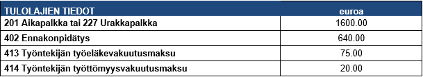 - Ilmoita esimerkiksi tuntipalkan, ylityökorvauksen ja lomarahan ennakonpidätykset yhteissummana.