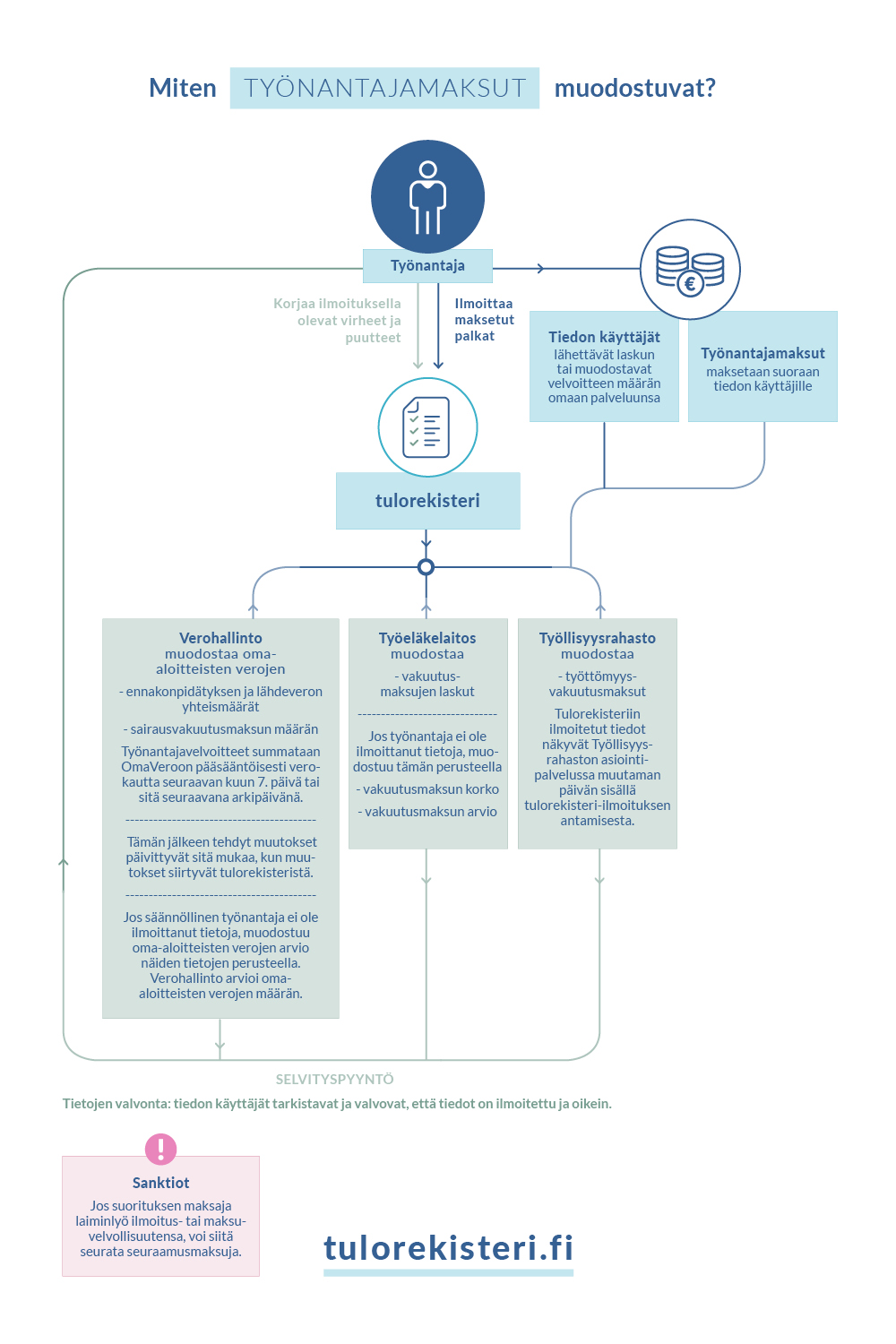 Tulorekisteristä tiedot välittyvät mm. Verohallintoon, eläkeyhtiöön ja Työllisyysrahastoon.